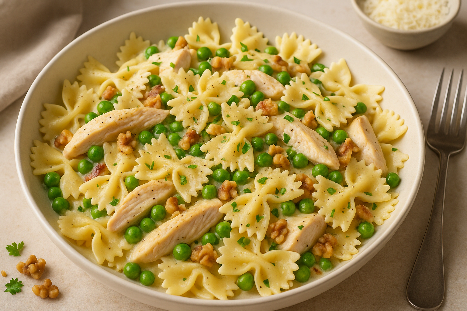 One of the best things about this dish is how well the flavors balance each other. The pancetta adds a salty, savory punch, while the peas bring in a hint of natural sweetness and a pop of color. Chicken breast provides lean protein, making the pasta more filling without being too heavy. The sauce, made from cream, milk, Parmesan, and egg yolks, coats every piece of pasta with a luscious, velvety texture. A sprinkle of walnuts at the end not only adds crunch but also gives the dish a subtle earthy note that ties everything together.